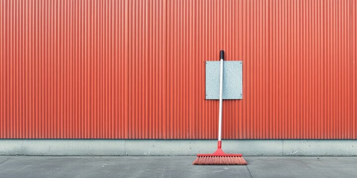 Broom and roller resting against a vibrant red corrugated steel wall with a gray rectangular panel on the left side of the image.