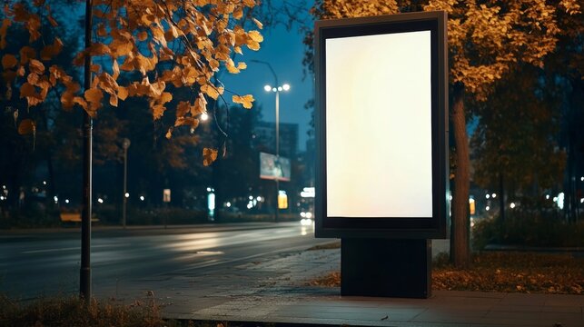 Blank luminous advertising display on illuminated street, ideal for nighttime marketing campaigns.