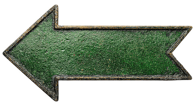 An aged, green directional arrow, outlined with weathered metal, points toward the left on black