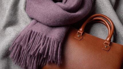 Close-up of a brown leather handbag and a purple scarf. the handbag is on the right side of the image, with the scarf on the left side.