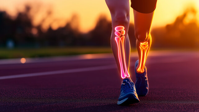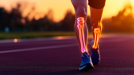Close up of athlete leg while running, showcasing glowing bones and joints. dynamic motion captures energy and strength of runner against sunset backdrop