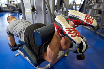 sport, fitness and bodybuilding concept - man exercising and flexing muscles on leg curl machine in gym
