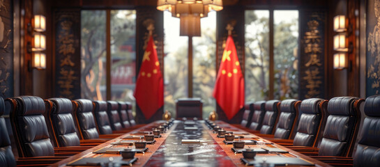 Chinese flags in an empty meeting room with a wooden table and many chairs. Selective focus.