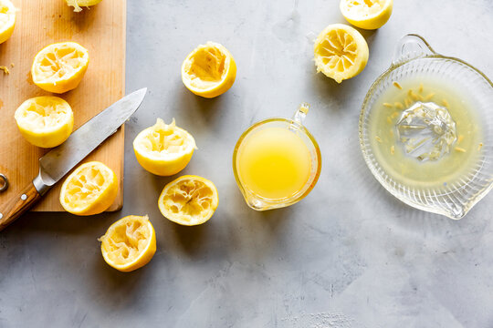 Vibrant lemon and grapefruit slices surround bottles filled with fresh citrus juices in a bright kitchen setting