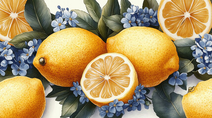レモンとブルーフラワーの美しい水彩画