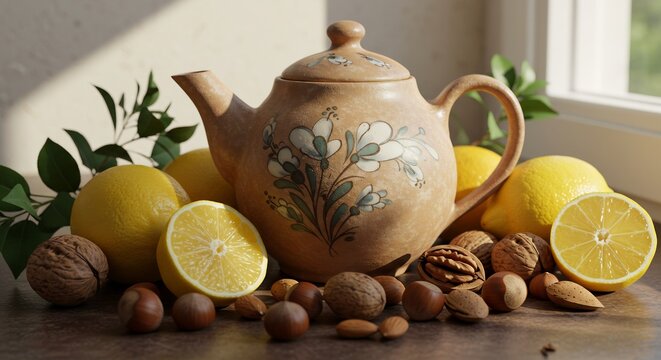 温かい日差しの中、花柄のティーポットとレモン、ナッツの静物画