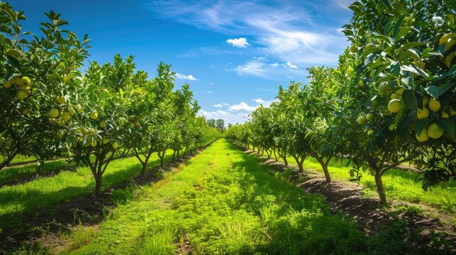 a scenic lemon orchard landscape with rows of Citrus x limon trees.