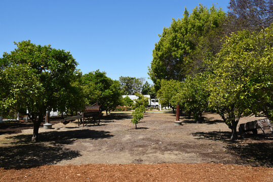 A citrus grove, with rows of orange and lemon trees stretching into the distance