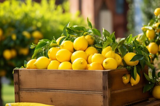 Ripe yellow lemons in the wooden box. Close-up, Italian vibes