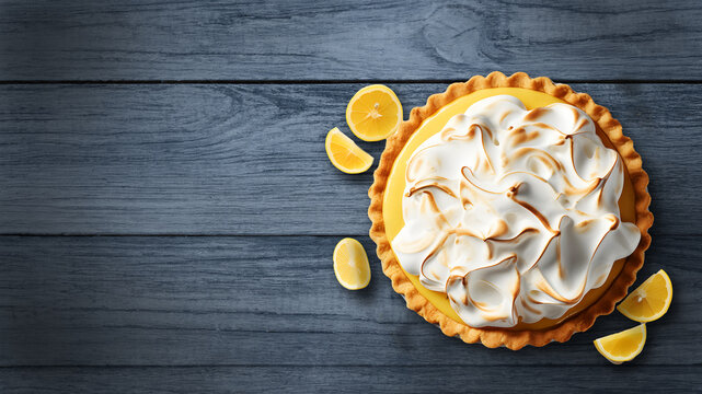 summer time lemon meringue pie with lemon slice isolated on a wooden background with copy space