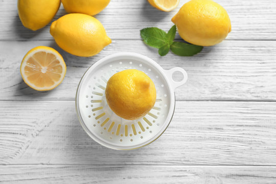 Composition with lemons and plastic squeezer on wooden table