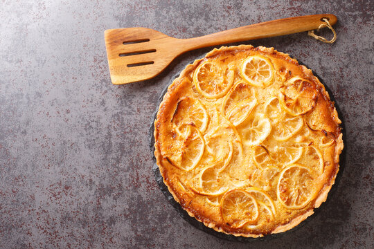 Homemade sweet and sour tart with lemon curd and fruit pieces close-up in a plate on the table. horizontal top view from above
