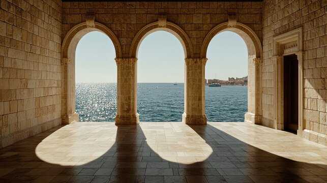 Stone arches frame a seascape, sunlit shadows lengthen across a tiled floor. Three archways open to blue water and distant land