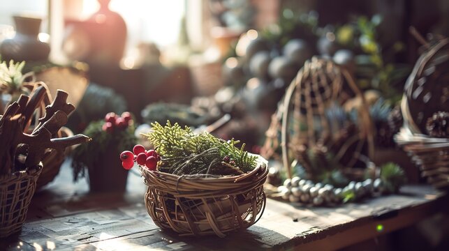 Festive Christmas Crafts Illuminated by Natural Light with Macro Lens Capturing High Contrast Details and Empty Space for Text or Graphics