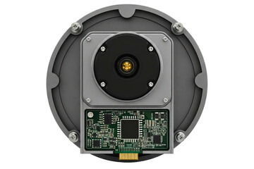 Rear view of electronic camera module with green circuit board isolated on a transparent background