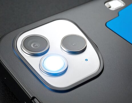 close-up of a sleek modern smartphone camera module with three large lenses, small sensor, led flash, metallic frame and textured back conveying a premium high-tech mood