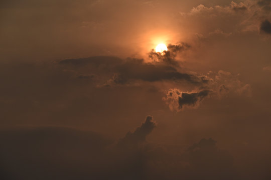 Beautiful cloudy sunset sky. bright sun peeps out of the storm clouds. Sunset colors