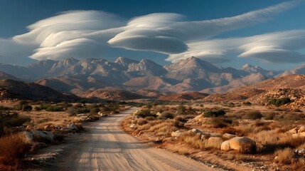 Prairie road leads to lenticular cloud, sunny day