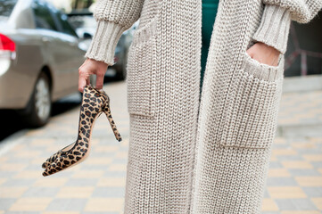 Close-up view of woman in leopard print dress and black high heels sitting on wooden bench and holding small beige blank handbag. Soft focus. Copy space. Fashion business theme.