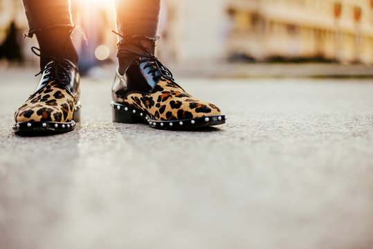 Legs of a woman in shoes. Close-up of fashionable leopard print shoes paired with wide-legged trousers on a city street
