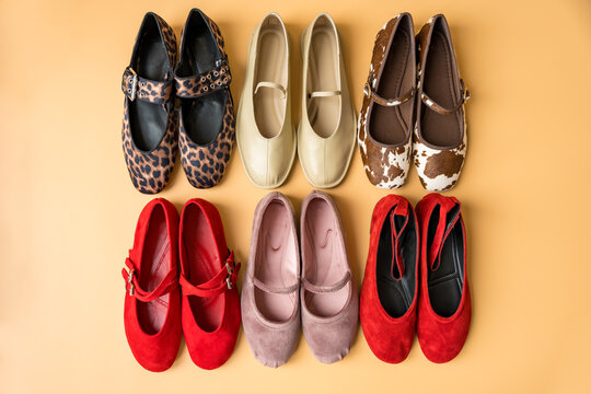 Flat lay of stylish ballet flats in various colors and patterns on pastel background