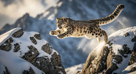 Snow leopard in mid-air jumping between snowy cliffs. Majestic big cat in a powerful leap in the high mountains of the Himalayas.