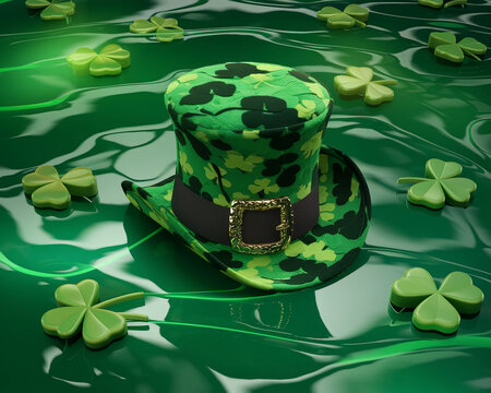 A 3D rendered image of a green leprechaun hat with a clover pattern floating on water, surrounded by shamrock clovers, symbolizing St. Patrick's Day and good luck.