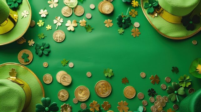 Flat lay of St. Patrick's Day symbols including shamrocks, leprechaun hats, and gold coins.