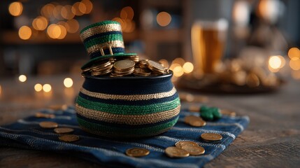 Festive pot with gold coins and a leprechaun hat on a table, symbolizing St. Patrick's Day celebration with bokeh lights in the background.