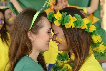 Portrait of two young beautiful women with bright multi-colored hair and face paint