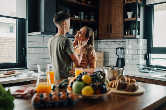 Breakfast time with caucasian lesbian couple in sunny kitchen