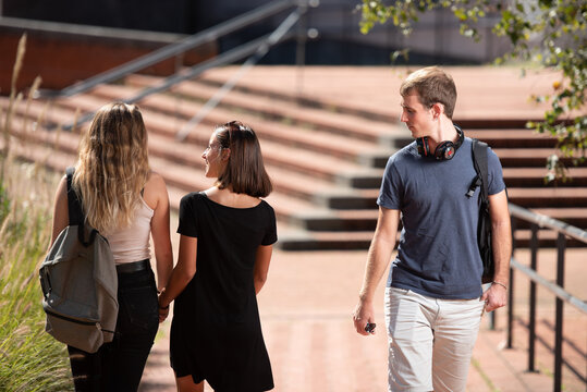 A couple of lesbian students walking together holding hands while a surprised sceptic boy is looking at them.