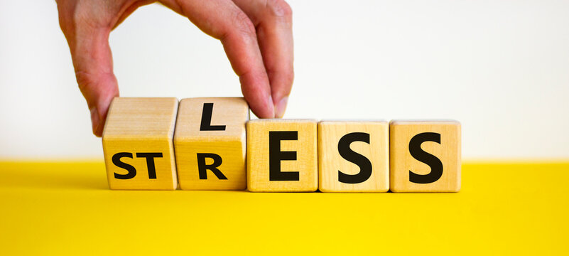 Having less stress or being stress-less. Hand turns a cube and changes the word "STRESS" to "LESS".