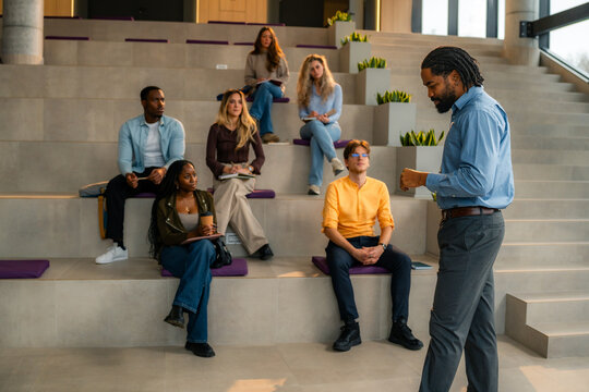 Audience with blurred speaker giving presentation in bright university workshop lecture hall background. Scientific conference presentation event, training, meeting. High quality