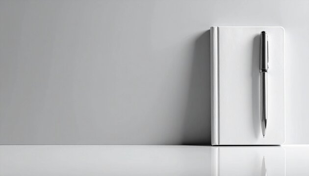 A minimalist composition of a blank, white notebook and a sleek pen, resting against a plain, neutral wall, evoking notions of writing, planning, and creativity