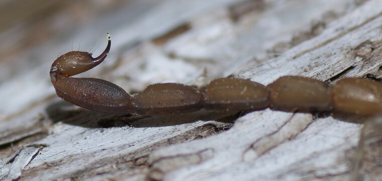 Centruroides hentzi close up of stinger and tail - Florida native painful but non lethal - sting equal to bee sting - on cypress tree wood