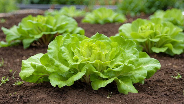 Fresh romaine lettuce garden close-up showing crisp green leaf texture for healthy food