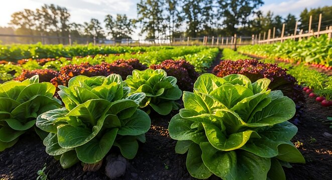 Fresh lettuce growing in a lush green field with rows of crops