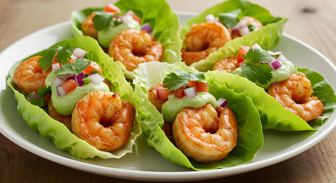 Delicious Shrimp Appetizers in Lettuce Cups with Colorful Toppings on a Plate
