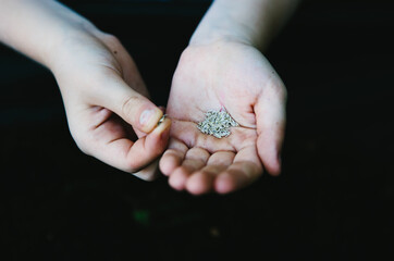 A child's hands holding lettuce seed.