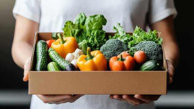 Close-up of hands holding a cardboard box full of fresh, colorful vegetables like cucumbers, peppers, broccoli, lettuce, garlic, and tomatoes on display