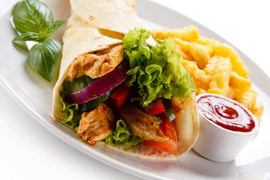 Crispy chicken wrap with lettuce and sauce. Delicious fast food meal