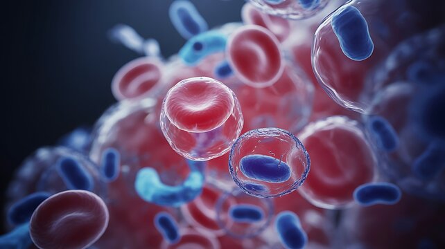 Microscopic view of red blood cells and white blood cells in the bloodstream