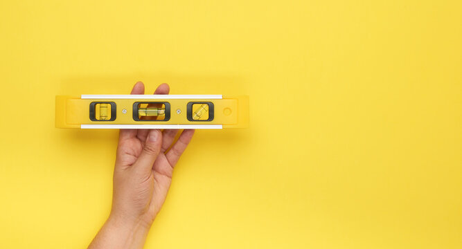 female hand hold plastic yellow level tool with capsules on a yellow background