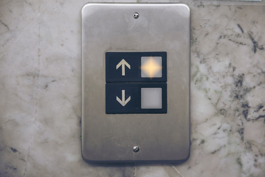 Close up waman hand press a up button of elevator inside the building for upper high level floor.
