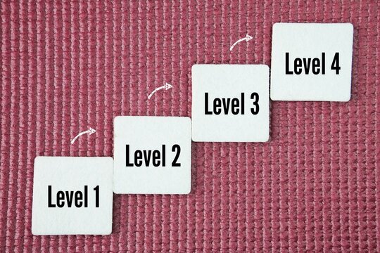 Square four is arranged in steps with the words Level 1, Level 2, Level 3 and level 4. most commonly to stages in an educational or vocational qualification framework, or to the levels of a training
