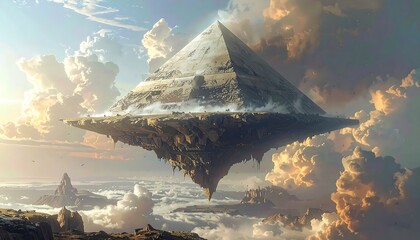 A pyramid structure floating atop a fragmented island in a sky filled with clouds. Sun subtly peaks through