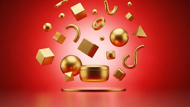 Golden 3D Shapes Floating Above Platform.