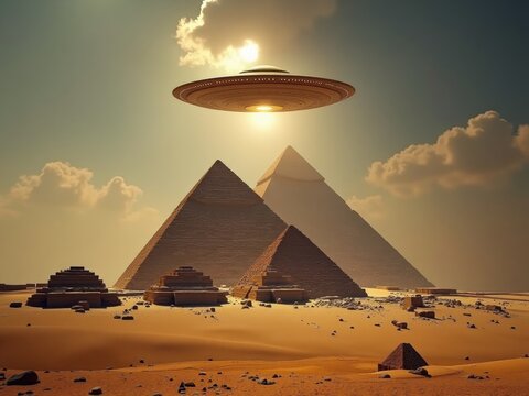 UFO hovering above ancient pyramids on desert sand
