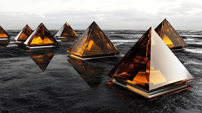 **A crisp depiction of geometric pyramid shapes hovering in asymmetry